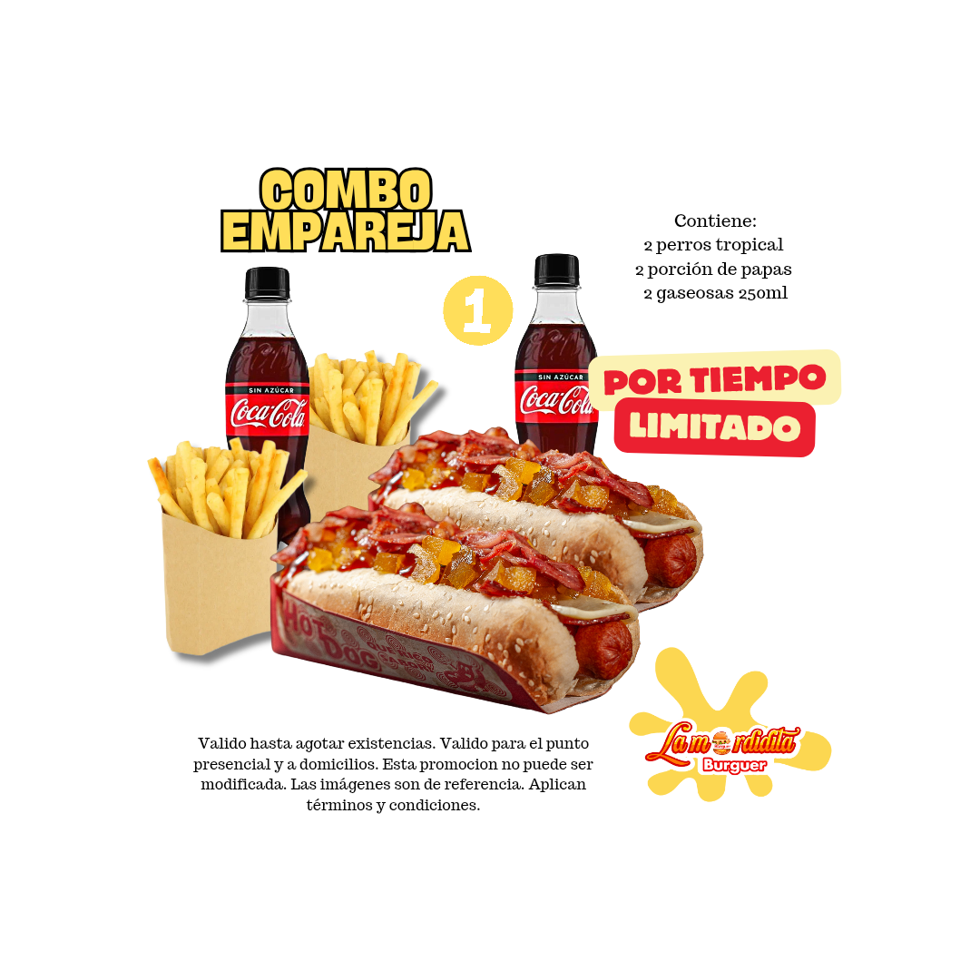 2 perros hawaianos + 2 porciones de papas + 2 coca-cola 250ml