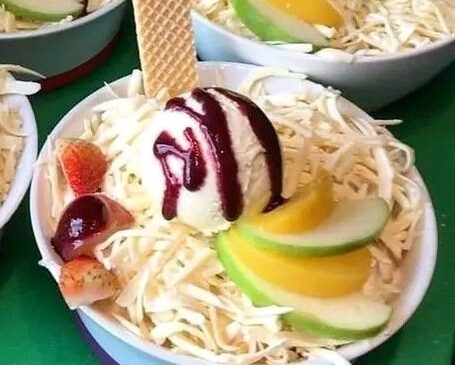 Exquisito postre elaborado con: papaya, melón, banano, fresa, guanábana, mango, kiwi, manzana, crema de la casa y queso rallado y 1 bola de helado a tu elección