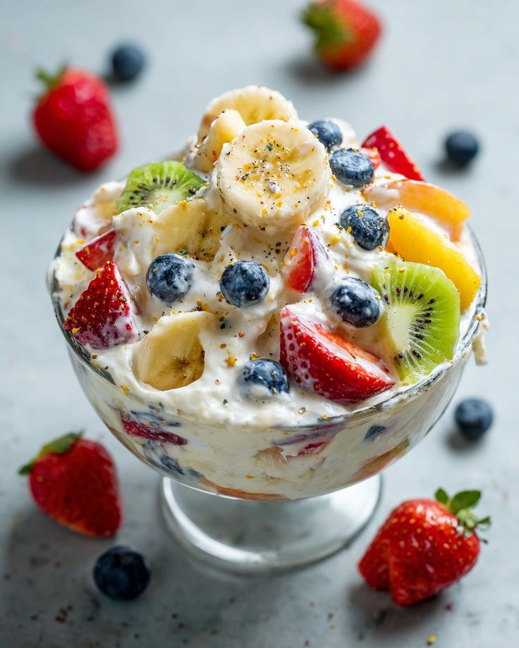 Exquisito postre elaborado con: papaya, melon, banano, fresa, gunabana, mango, kiwi, manzana, crema de la casa y queso rallado.