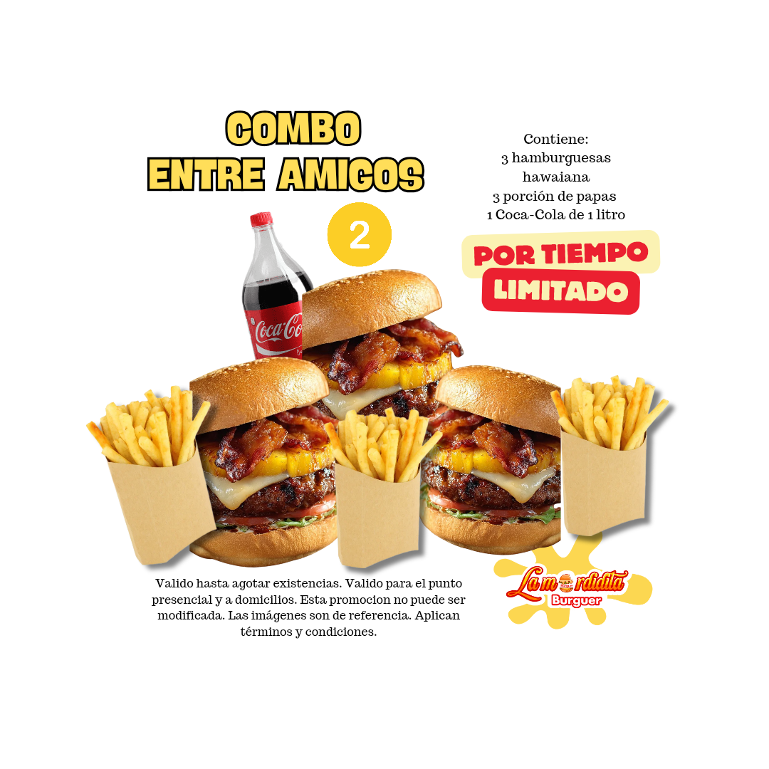 3 Hamburguesas Hawaianas + 3 porciones de papa + 1 coca-cola de litro