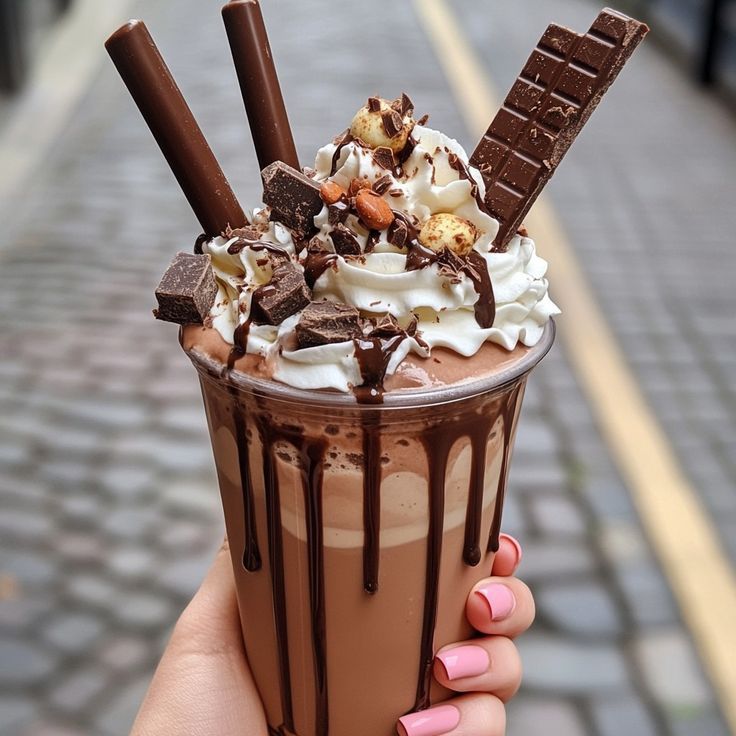 Deliciosa malteada elaborada con helado de chocolate acompañada de Chantilly chocolatina jumbo, mani, m&ms y salsa de arequipe.
